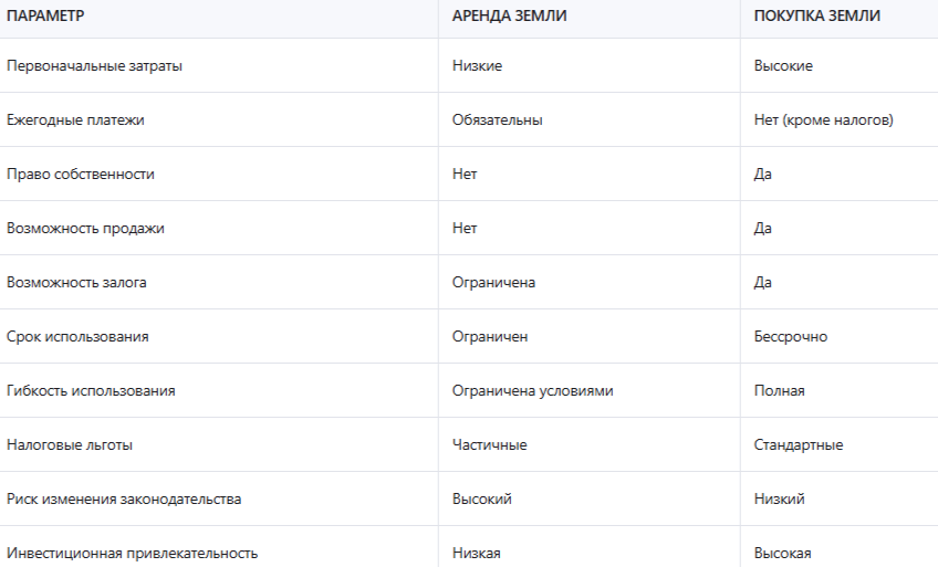 Эта таблица наглядно демонстрирует основные различия между арендой и покупкой земли. Выбор между этими вариантами зависит от целей использования земли, финансовых возможностей и долгосрочных планов. Аренда подходит для краткосрочных проектов и ограниченного бюджета, а покупка — для долгосрочных инвестиций и полной независимости.